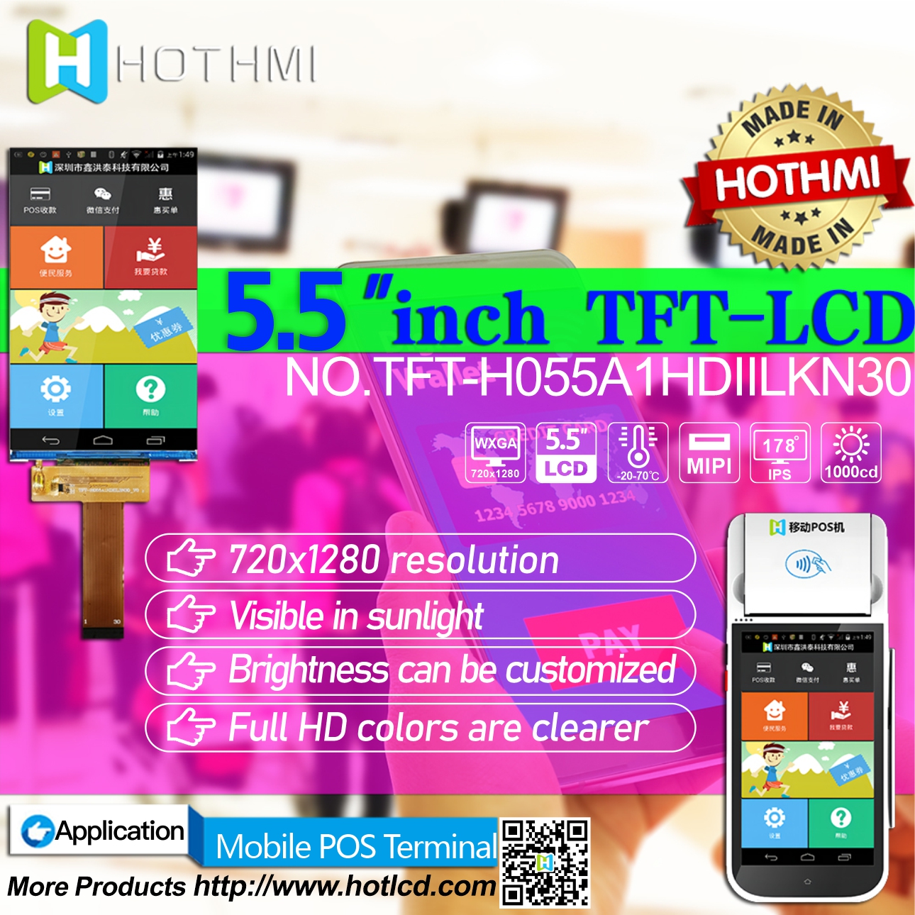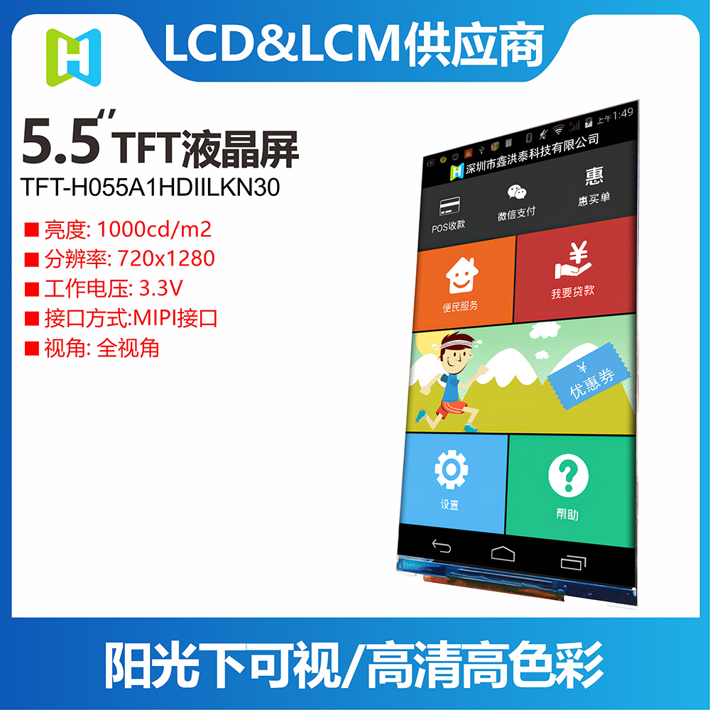TFT-H055A1HDIIL3N30 is a 5.5-inch 720x1280 full-color HD high-definition TFT LCD module. This TFT-LCD supports MIPI DSI interface and adopts wide viewing angle IPS (In-plane Switching) panel technology. Vivid, high-quality picture with saturated naturalness. This model has an operating temperature of -20°C to +70°C and a storage temperature of –30°C to +80°C. The size of this TFT module is 67.932x120.768mm, the size of the Active area (AA area) is 71.04x129.56 mm, the module has a built-in driver IC ILI9881 (driver IC), and the working power supply voltage: 3.3V. The TFT-H055A1HDIIL3N30 module is in the straight screen mode, if you need to use the horizontal screen mode, please contact us, and we will provide relevant technical support services.
