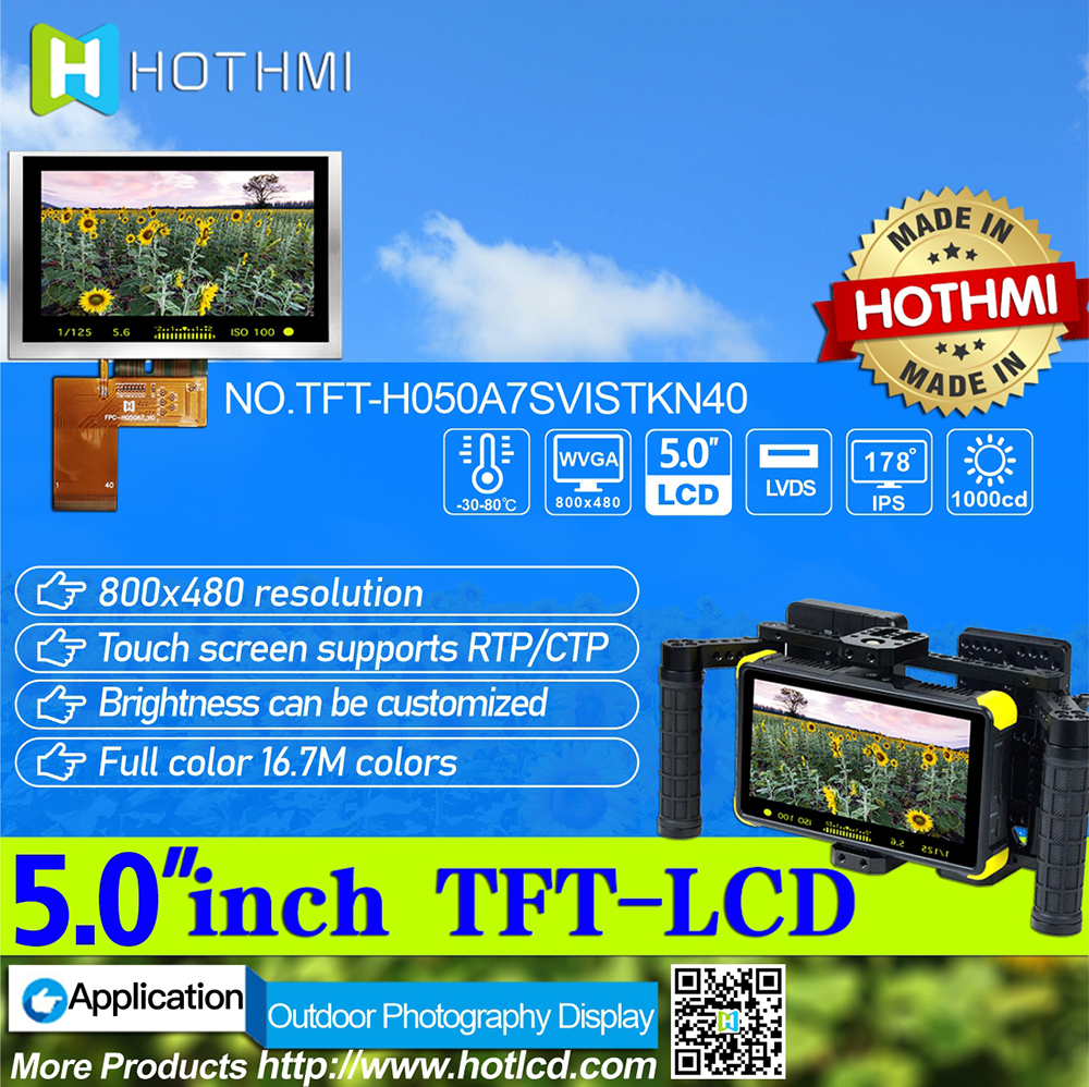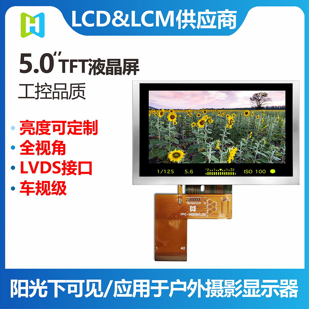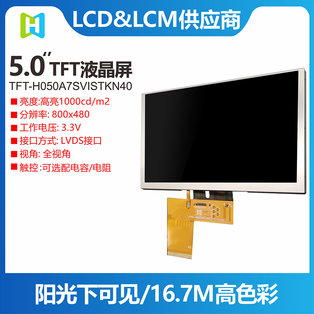 • 型號(hào): 5.0寸TFT彩色液晶屏/800*480分辨率/全視角IPS工藝|高亮 陽光下可視/LVDS接口/TFT-H050A7SVISTKN40