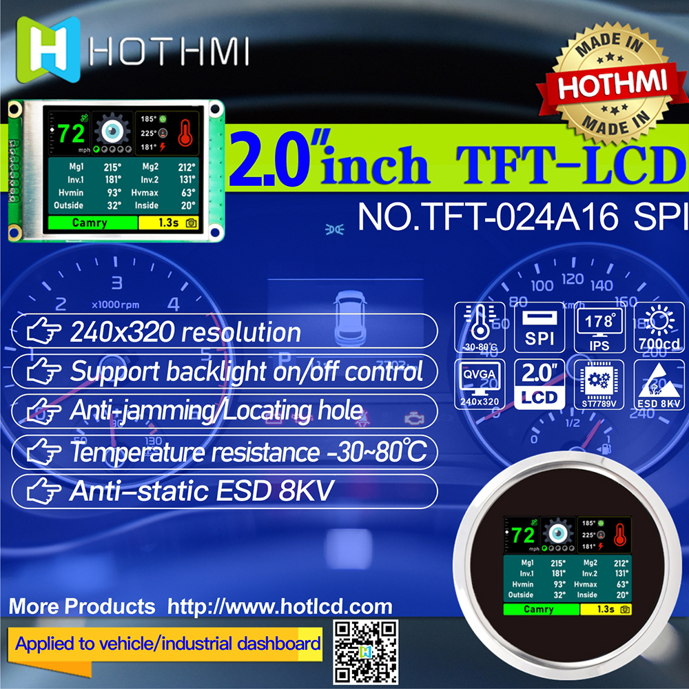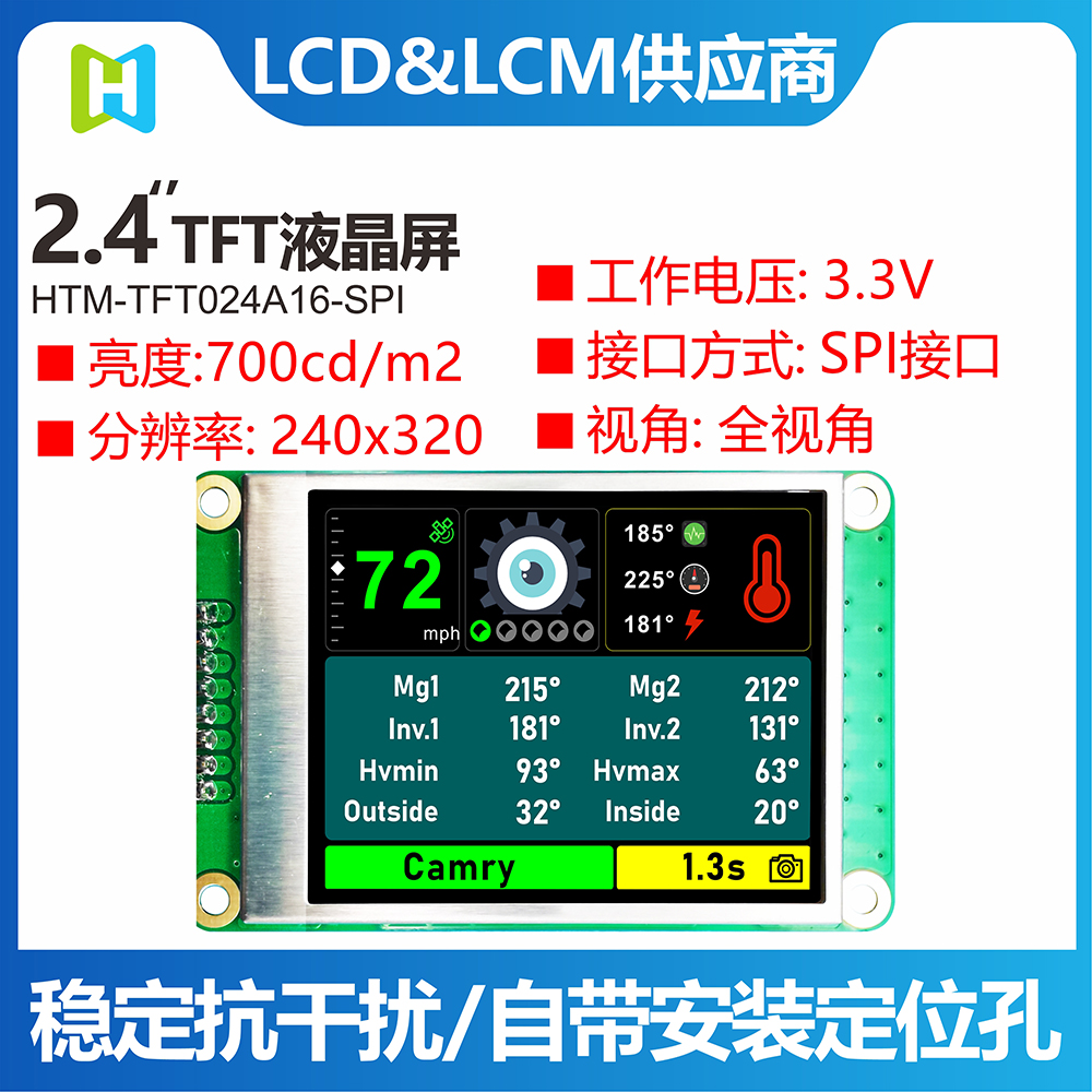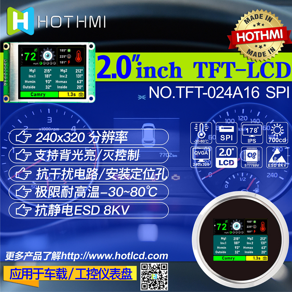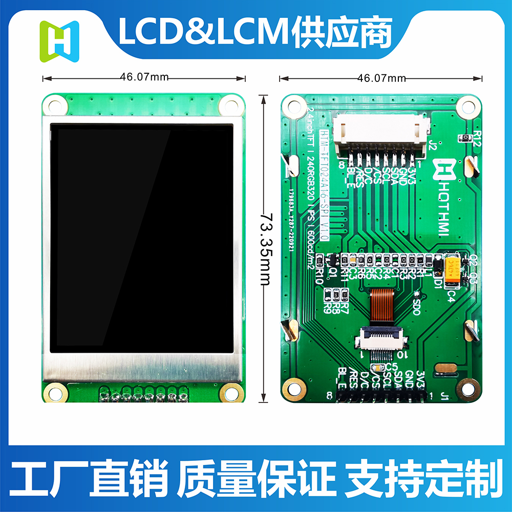 HTM-TFT024A16-SPI是HOTLCD研發(fā)團隊精心設計的2.4英寸TFT彩色液晶帶板顯示屏,240*320分辨率,高畫質,廣視角,65K/262K真彩色,內置ST7789V控制器,支持MCU