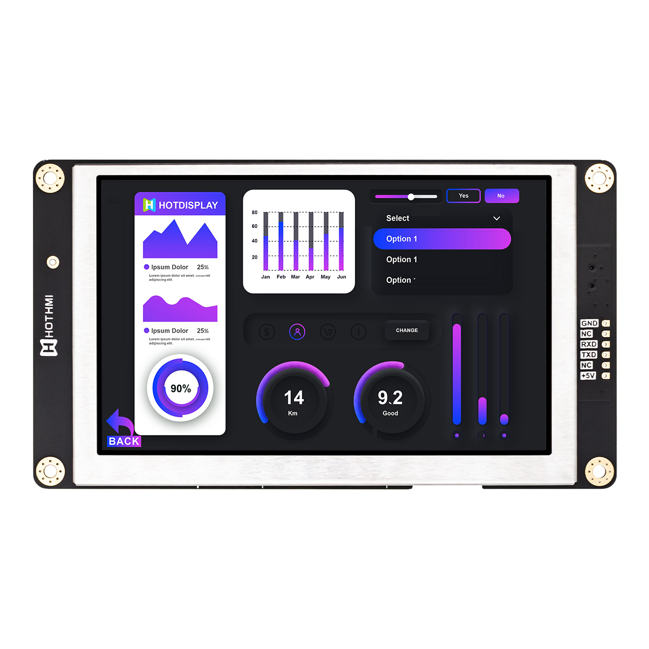 HTM-H050A1-UART-A5是一款 5.0英寸 IPS TFT 顯示屏,分辨率為 800x480 像素。它是一款帶有智能顯示功能的顯示屏,有UART接口,人機(jī)信息交換功能。除了控制器之外,我們的 HMI 顯示器還集成了 MCU 功能。MCU 通過 UART 接口接收主控制板(客戶端)發(fā)送的命令,然后根據(jù)這些預(yù)定義的指令顯示文本、圖像或動畫。主控制板(客戶端)上的 MCU 不需要專門針對圖像顯示的復(fù)雜編程或執(zhí)行。您可以使用我們的 GUI 設(shè)計軟件 - UI 編輯器輕松創(chuàng)建文本、圖像或動畫。無需編程技能。