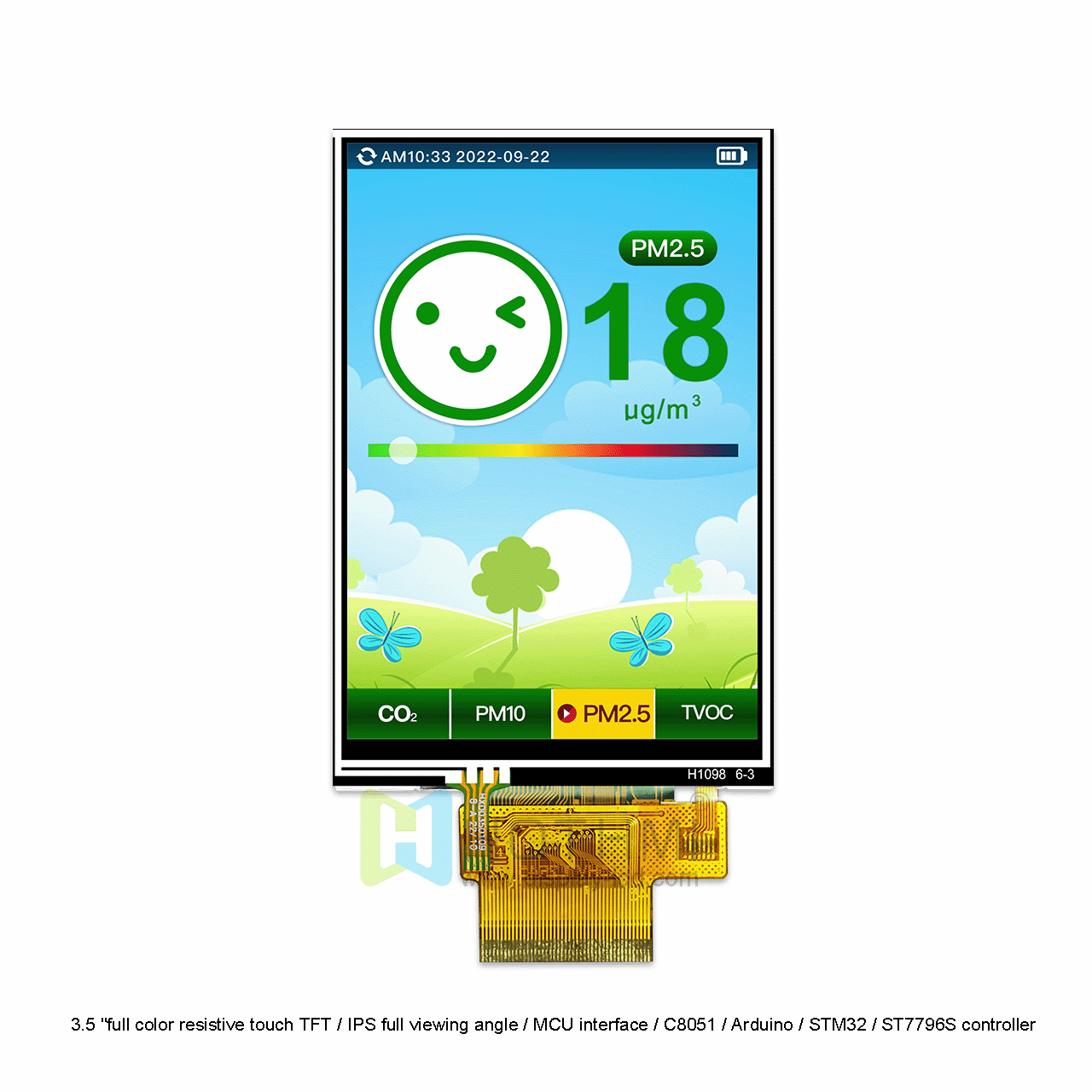 3.5寸 320x480點(diǎn)陣TFT液晶顯示屏/3.5“全彩電阻觸摸TFT/IPS全視角/MCU接口/C8051/Arduino/STM32/ST7796S控制器 型號(hào)TFT-H035A5HVTST2R45是一款I(lǐng)PS全視角的顯示屏,畫(huà)質(zhì)高,對(duì)比度高,色域廣。它的分辨率320x480,內(nèi)置ST7796S控制器,這個(gè)型號(hào)是帶有電阻觸摸功能的,支持MCU接口,65K/262K真彩,F(xiàn)PC連接(可選連接器),3.3V電壓。Hot Display的顯示屏工作溫度范圍廣,這款產(chǎn)品的工作溫度范圍為-20 ℃~ +70 ℃。 所有材料均符合環(huán)保要求和 RoHS 標(biāo)準(zhǔn)。 該模塊廣泛應(yīng)用于各種儀器儀表、智能設(shè)備等,適用于Arduino等系統(tǒng)。