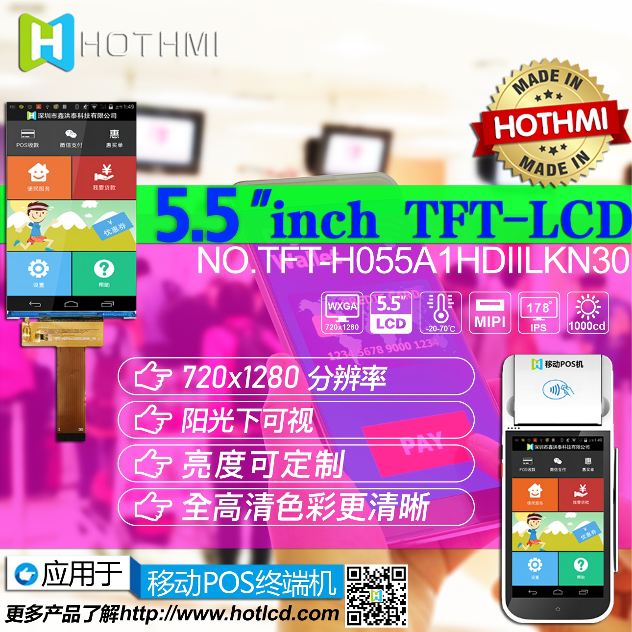 TFT-H055A1HDIIL3N30 is a 5.5-inch 720x1280 full-color HD high-definition TFT LCD module. This TFT-LCD supports MIPI DSI interface and adopts wide viewing angle IPS (In-plane Switching) panel technology. Vivid, high-quality picture with saturated naturalness. This model has an operating temperature of -20°C to +70°C and a storage temperature of –30°C to +80°C. The size of this TFT module is 67.932x120.768mm, the size of the Active area (AA area) is 71.04x129.56 mm, the module has a built-in driver IC ILI9881 (driver IC), and the working power supply voltage: 3.3V. The TFT-H055A1HDIIL3N30 module is in the straight screen mode, if you need to use the horizontal screen mode, please contact us, and we will provide relevant technical support services.