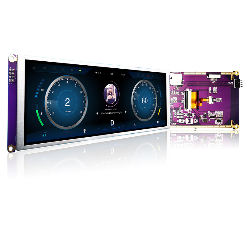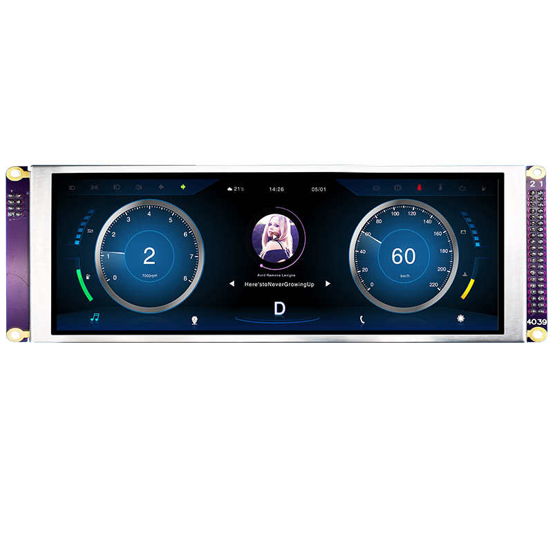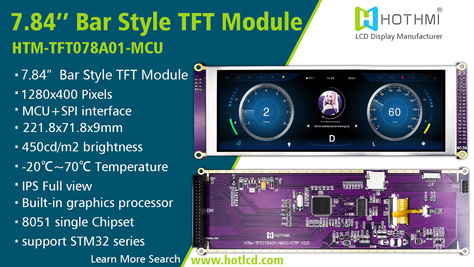 Screen Type: 7.84-inch Bar Style IPS TFT LCD Display Resolution: 1280x400 pixels LCD Controller Board: Included Luminance: 450cd/m2 Interface: MCU+SPI TFT Module Operating Temperature Range: -20°C to 70°C Built-in Graphics Processor Single Chipset: 8051 Supports STM32 series chipsets