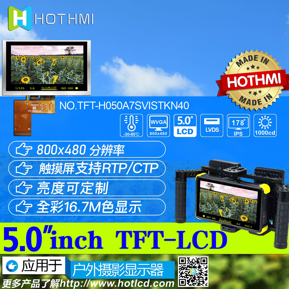 • 型號(hào): 5.0寸TFT彩色液晶屏/800*480分辨率/全視角IPS工藝|高亮 陽光下可視/LVDS接口/TFT-H050A7SVISTKN40