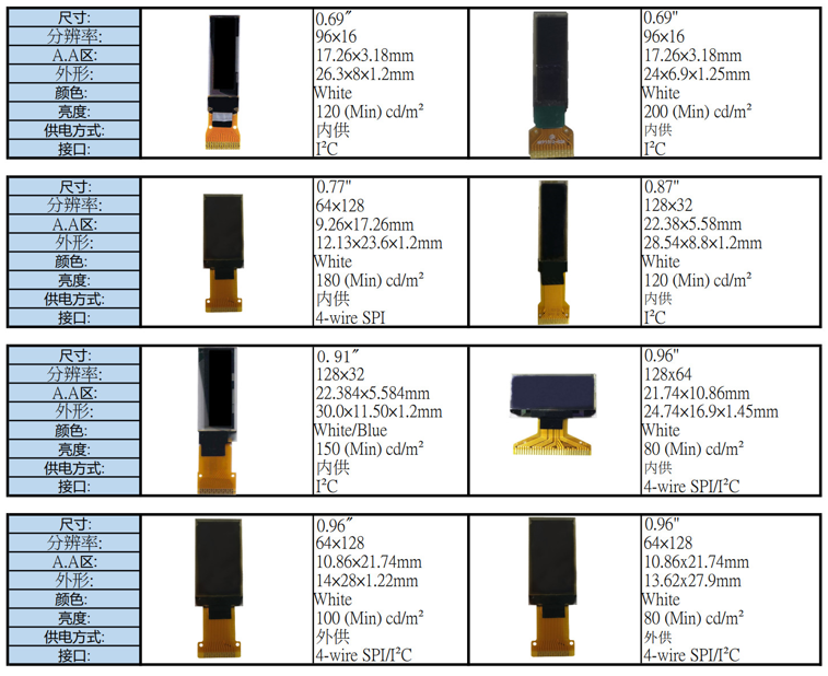 0.87寸OLED、0.91寸OLED、0.96寸OLED、0.96寸OLED2、1.09寸OLED、1.12寸OLED、1.29OLED、1.30寸OLED、