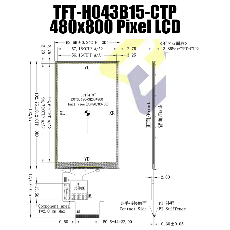 • 型號(hào): 4.3寸TFT IPS全視角 480X800分辨率 LCD電容觸控屏-TFT液晶模組廠 TFT-H043B15WVIST3C45