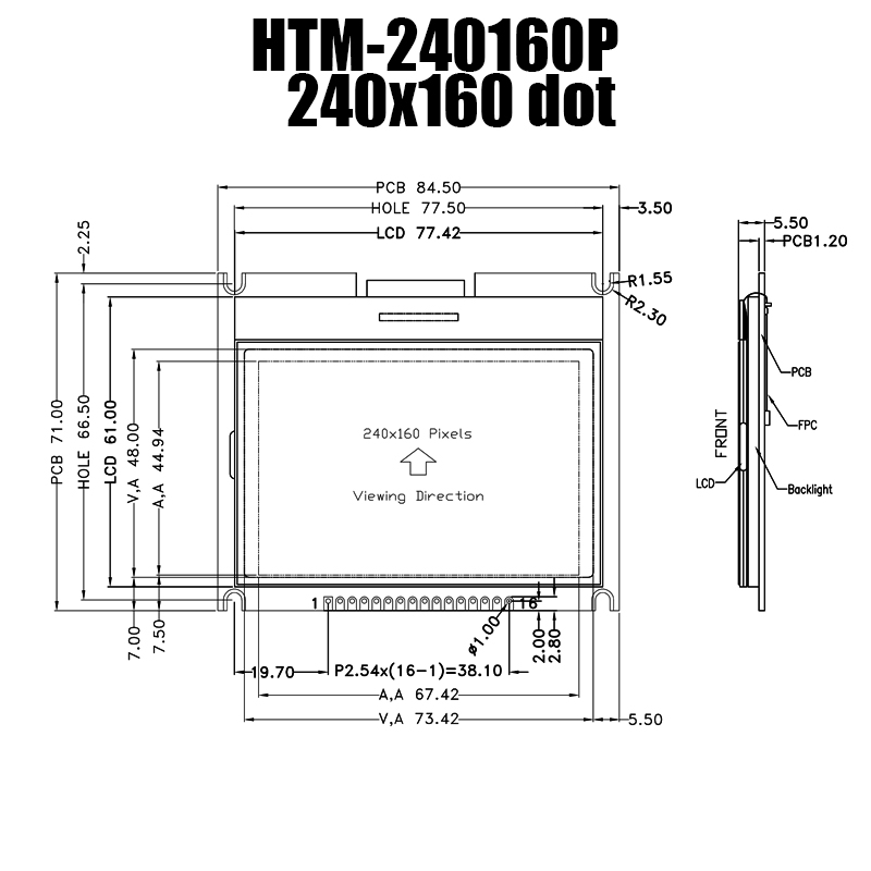 該模塊的分辨率為240x160像素,可顯示圖像和文本內(nèi)容。內(nèi)置負(fù)電壓驅(qū)動(dòng)電路,無需額外外部電路支持。背光顏色為白色,使得顯示內(nèi)容在暗光環(huán)境下也能清晰可見。