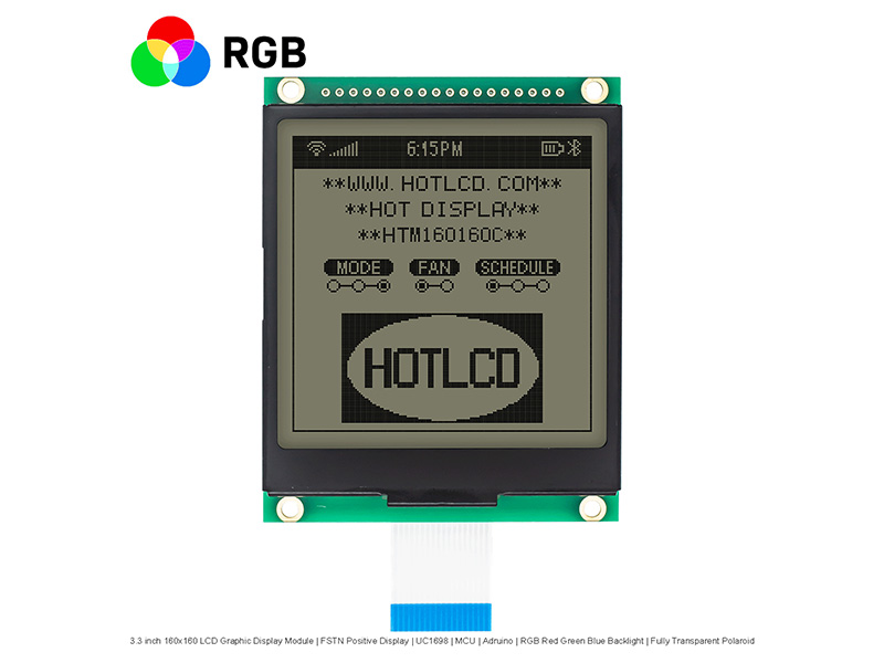 | 3.3 英寸160x160 LCD 圖形顯示模塊/FSTN+顯示屏/UC1698/Arduino/紅綠藍(lán)背光/全透偏光片 HTM160160C-35S-A3P | 圖形液晶模組 | 160x160 |
